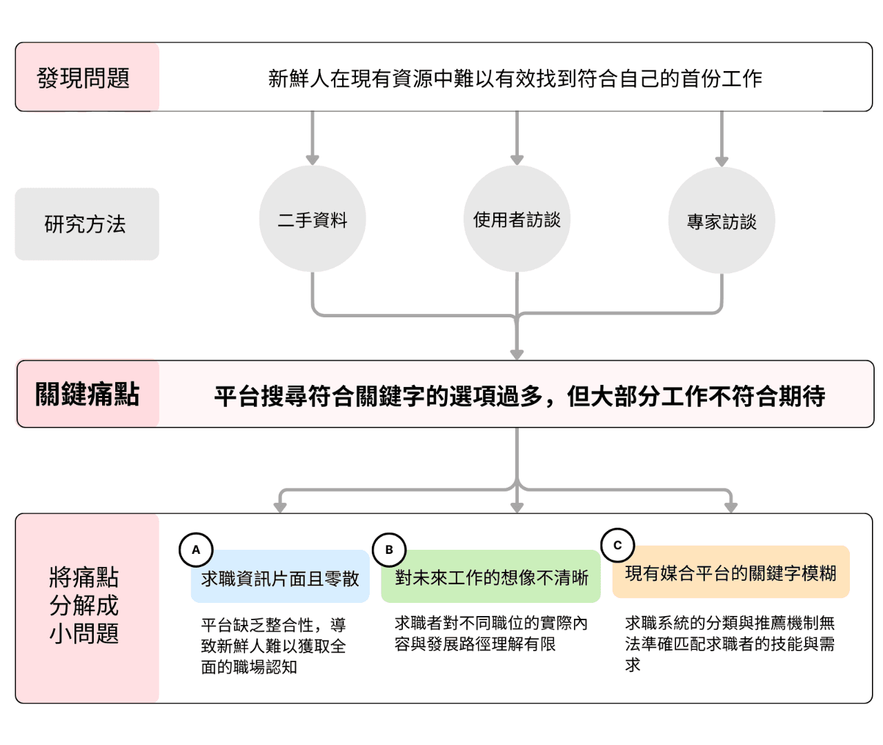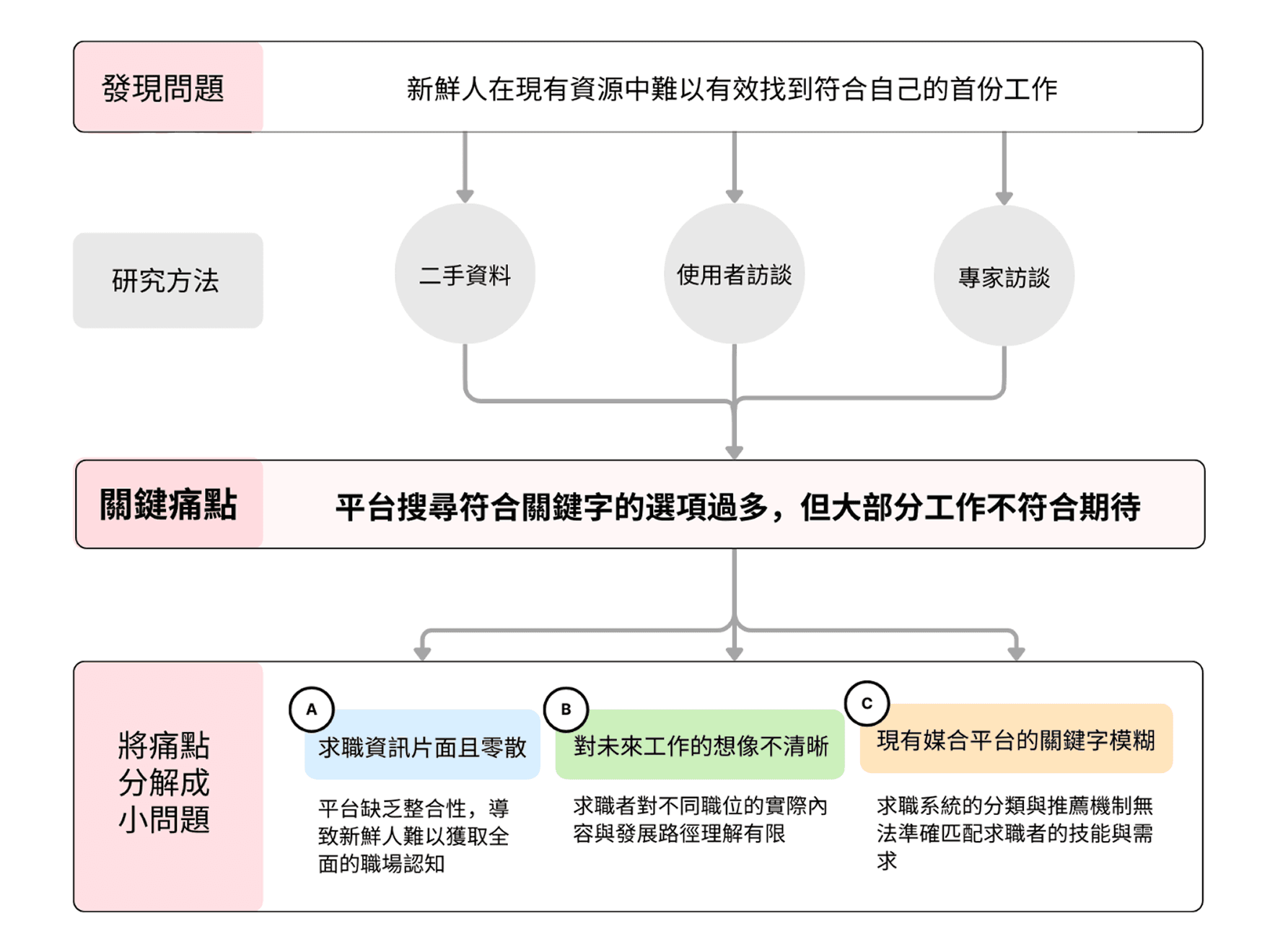 我能夠獨立研究問題並透過測試驗證假設以降低產品開發風險,也能根據研究結果規劃產品需求並設計核心功能。